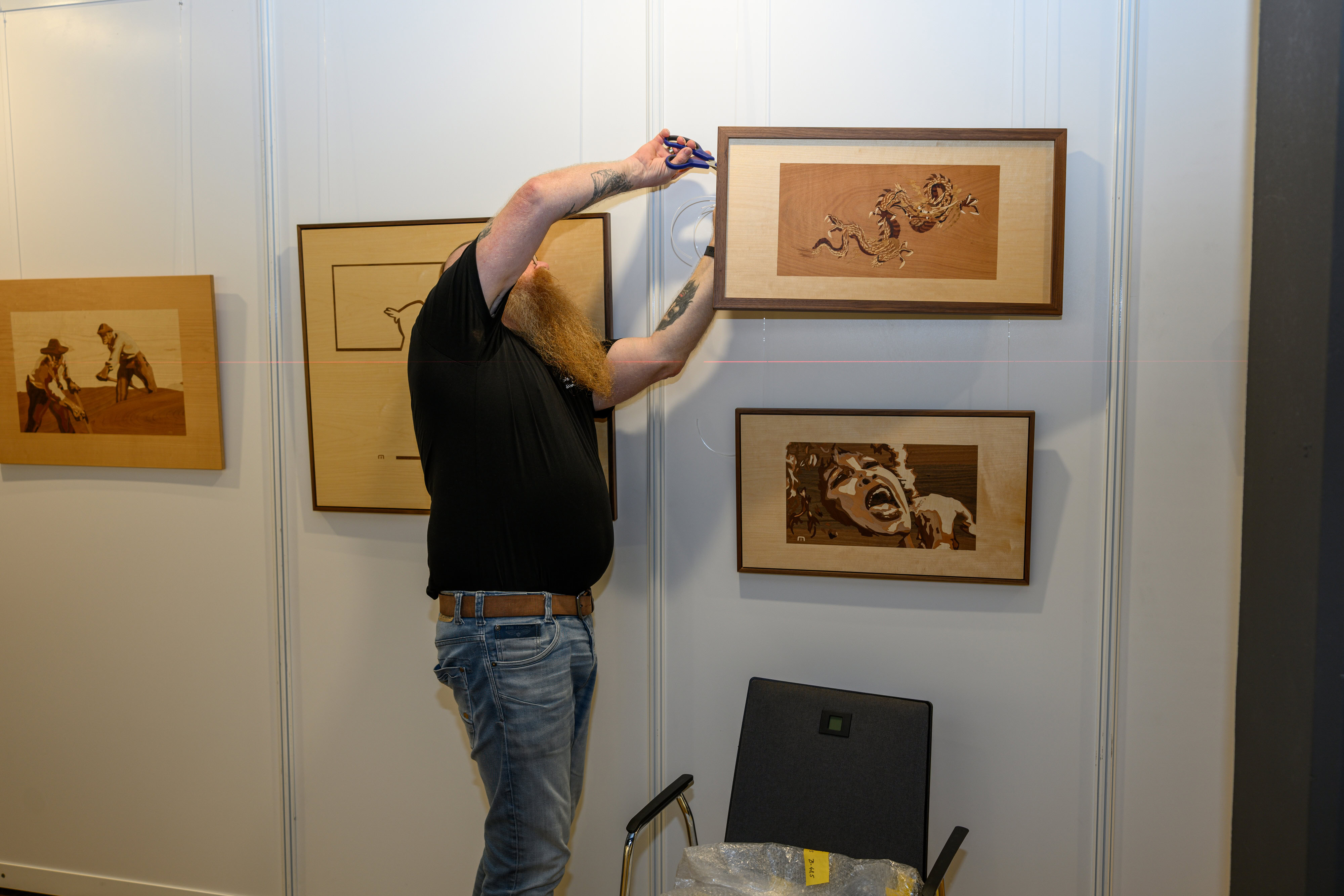 Meine Intarsienbilder folgen keinen herkömmlichen Standards für Höhe und Breite. Motiv und Holz (vor allem das Hintergrundfurnier) geben vor, wie hoch und breit ein Bild wird. Zwei gleiche Abmessungen kommen in meinem Portfolio daher gar nicht vor. Nach mehreren Stunden Tüfteln, Messen und Anpassen hatte ich schließlich alle Bilder an ihrem Platz.
